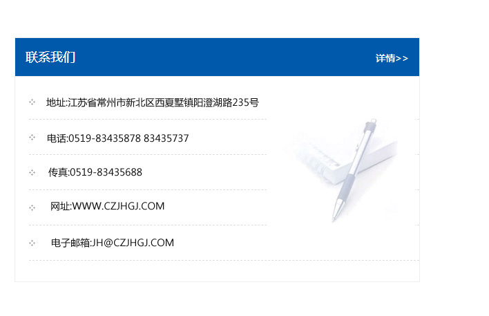 地址:常州市新北區友邦商務大廈1幢16、17層  電話:0519-85101652  傳真:0519-85112595  郵編:213022  網址:www.cz-jiayue_cn.lutxy.com  郵箱:xiajifengaa@163.com